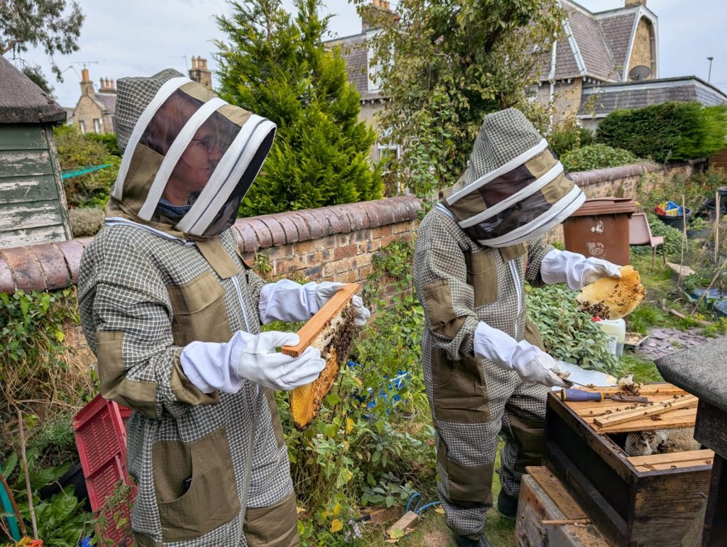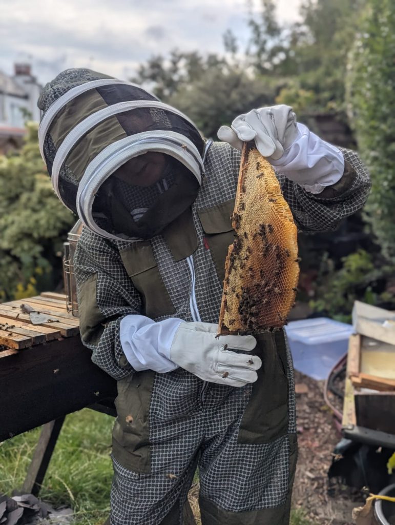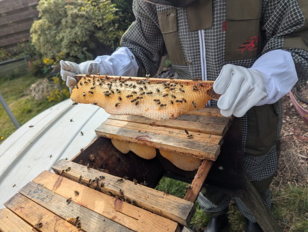 Do you want to see what it looks like in a top bar honey bee hive? Do you want to hear the loud, melodic hum of a busy hive? This is a workshop, you will be provided with a beesuit and gloves so that you can hold the bars with bees on and look right inside the colony. We will go over what to check for like queen cells. If there is extra honey we can gather some. You get to take some honeycomb home. See and taste the pollen and propolis also gathered by the bees. It is on Sunday 2nd november in Roslin. 2 – 3.30pm, weather permitting, £20. 2 places remain. It must be 11° or over to open a bee hive. Message to book a place or for more information. Honey comb is for sale. It is individually priced so not currently available on the helpful herbs website. Message for prices available between £4- £15.