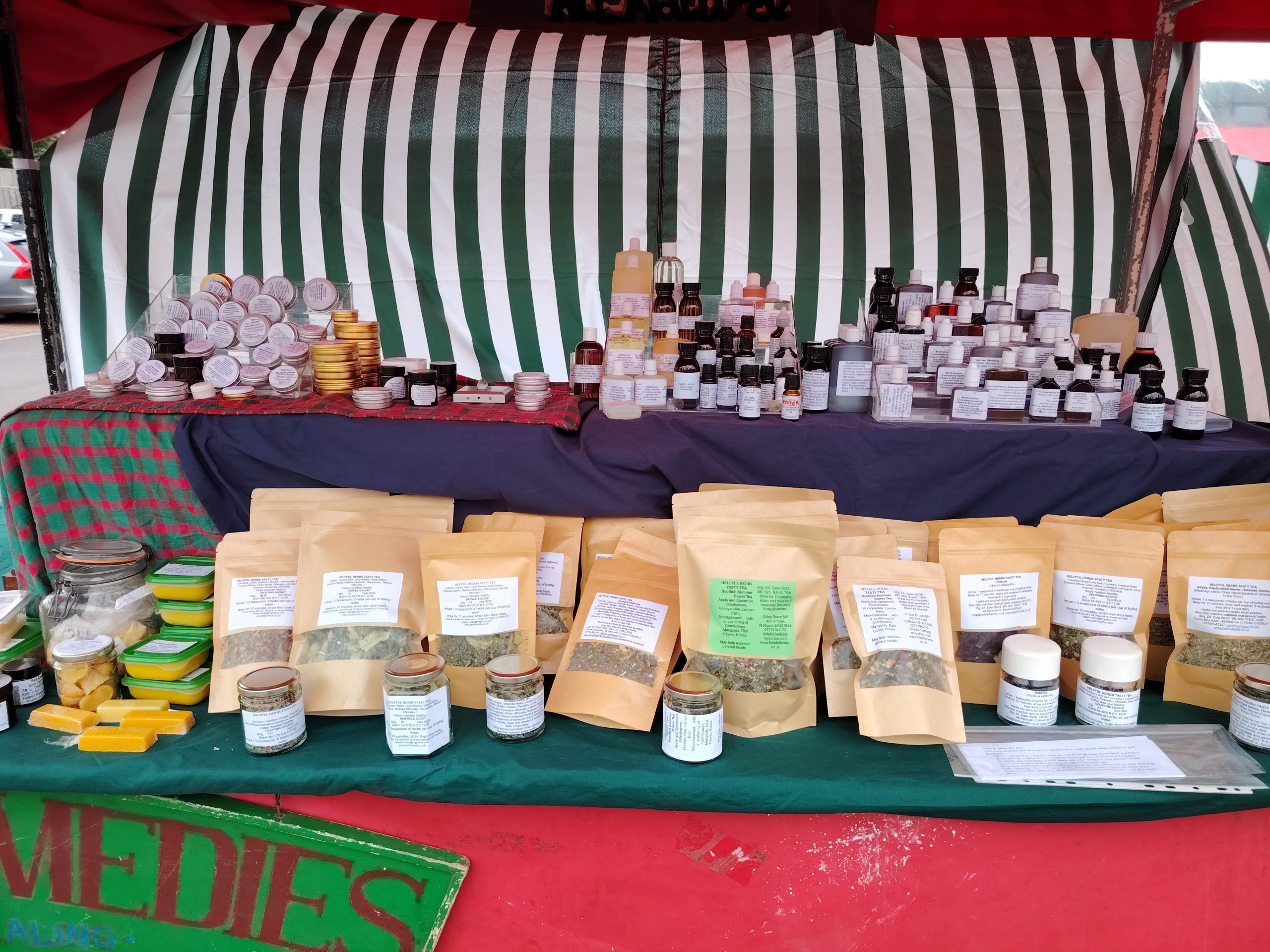 Herbal remedies including Midlothian herbal teas; natural, cruelty free skin products; herbal remedies; local, chemical free honeycomb; rhubarb jam for a bear support charity.